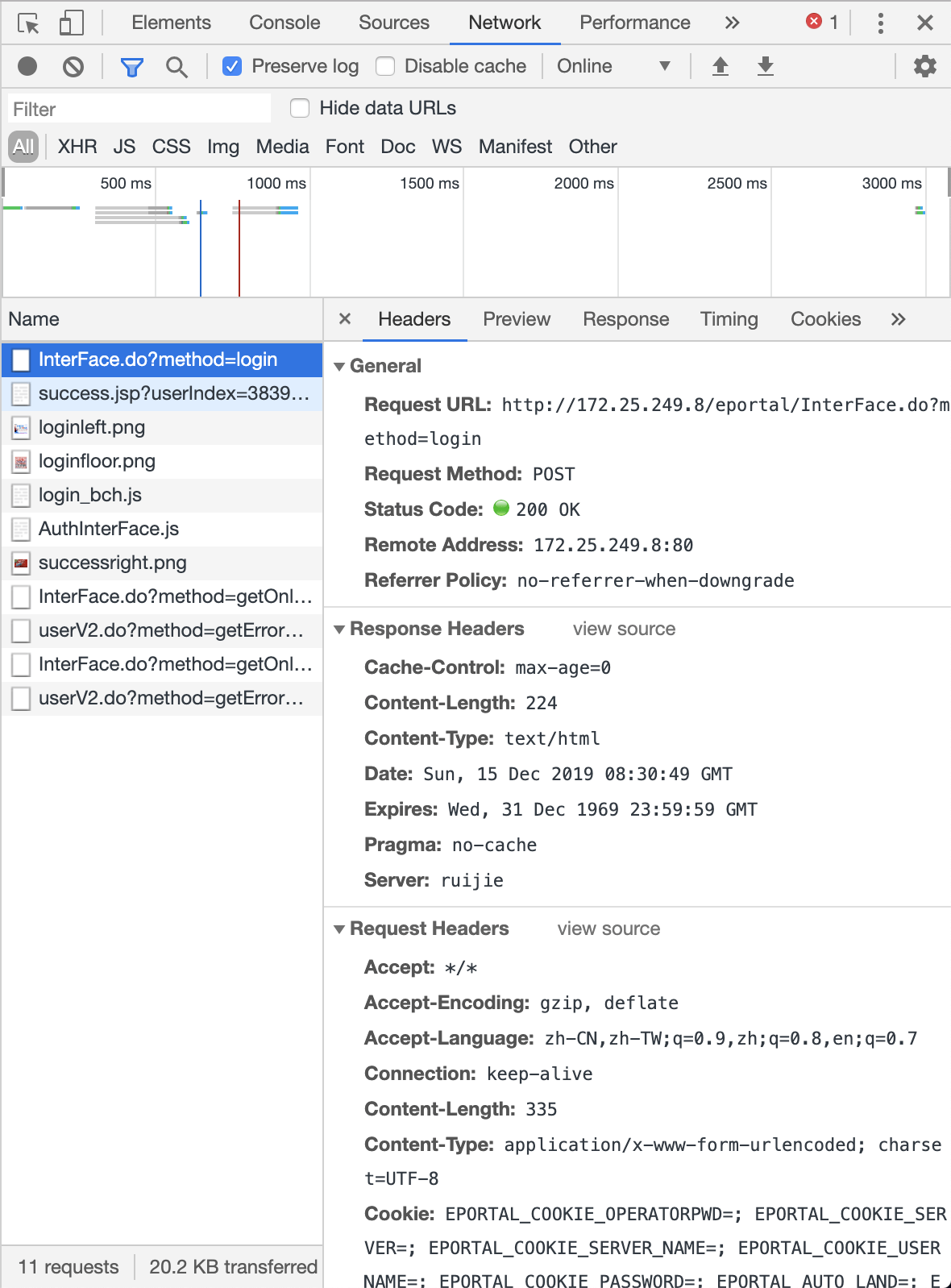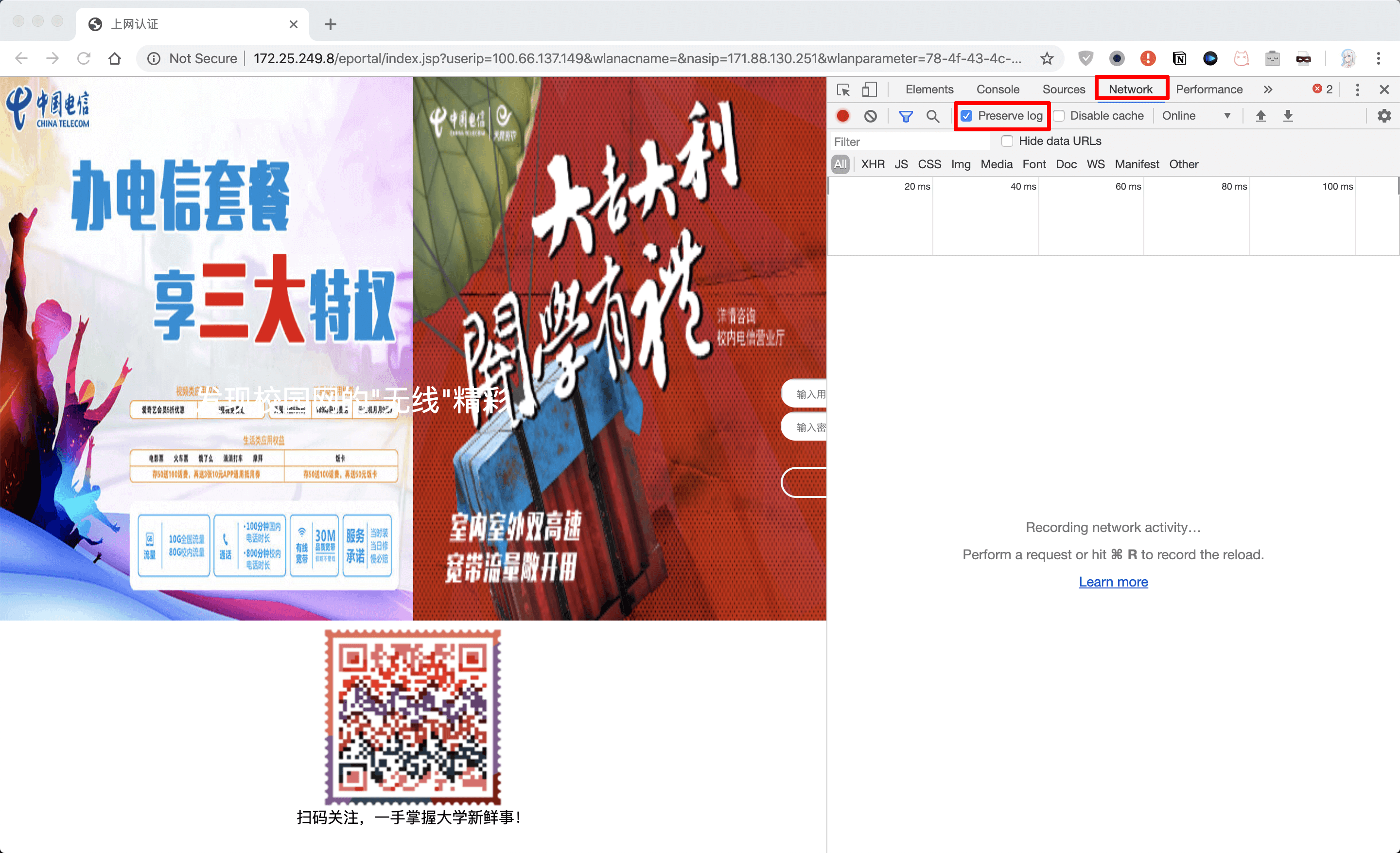 这里,我们使用 Chrome 的开发者工具来抓取请求。重启路由器后打开认证页面,按 command - option - I 调出开发者工具,切换到 Network 选项卡并勾选 Preserve log。