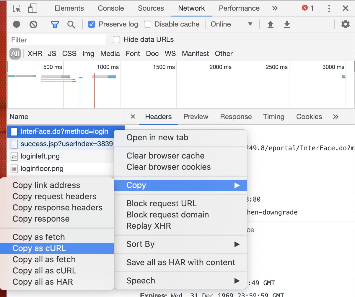 在找到这个请求后,我们在请求上单击右键,选择 Copy > Copy as cURL。