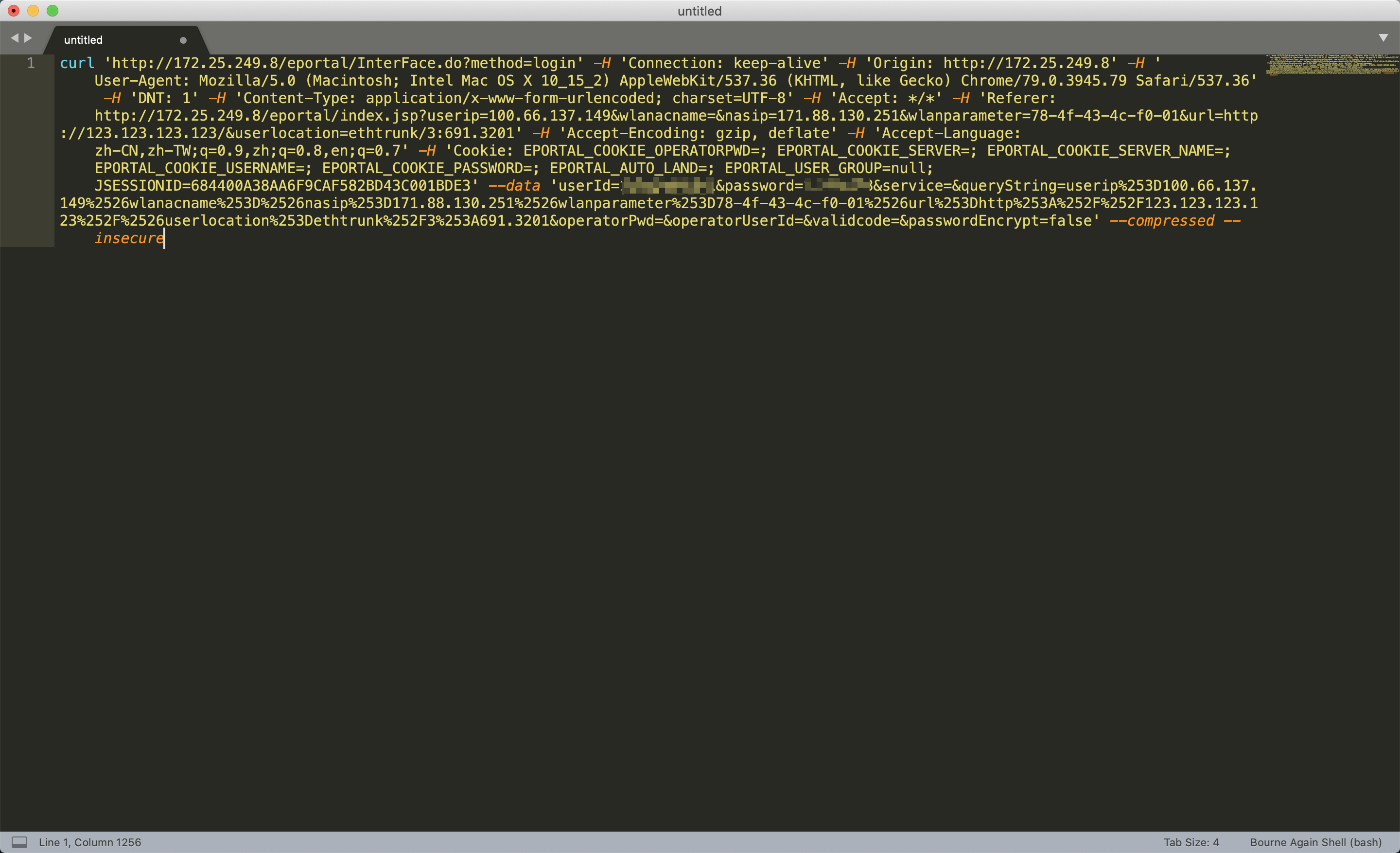 curl 'http://172.25.249.8/eportal/InterFace.do?method=login' -H 'Connection: keep-alive' -H 'Origin: http://172.25.249.8' -H 'User-Agent: Mozilla/5.0 (Macintosh; Intel Mac OS X 10_15_2) AppleWebKit/537.36 (KHTML, like Gecko) Chrome/79.0.3945.79 Safari/537.36' -H 'DNT: 1' -H 'Content-Type: application/x-www-form-urlencoded; charset=UTF-8' -H 'Accept: */*' -H 'Referer: http://172.25.249.8/eportal/index.jsp?userip=100.66.137.149&wlanacname=&nasip=171.88.130.251&wlanparameter=78-4f-43-4c-f0-01&url=http://123.123.123.123/&userlocation=ethtrunk/3:691.3201' -H 'Accept-Encoding: gzip, deflate' -H 'Accept-Language: zh-CN,zh-TW;q=0.9,zh;q=0.8,en;q=0.7' -H 'Cookie: EPORTAL_COOKIE_OPERATORPWD=; EPORTAL_COOKIE_SERVER=; EPORTAL_COOKIE_SERVER_NAME=; EPORTAL_COOKIE_USERNAME=; EPORTAL_COOKIE_PASSWORD=; EPORTAL_AUTO_LAND=; EPORTAL_USER_GROUP=null; JSESSIONID=684400A38AA6F9CAF582BD43C001BDE3' --data 'userId=<宽带账号>&password=<宽带密码>&service=&queryString=userip%253D100.66.137.149%2526wlanacname%253D%2526nasip%253D171.88.130.251%2526wlanparameter%253D78-4f-43-4c-f0-01%2526url%253Dhttp%253A%252F%252F123.123.123.123%252F%2526userlocation%253Dethtrunk%252F3%253A691.3201&operatorPwd=&operatorUserId=&validcode=&passwordEncrypt=false' --compressed --insecure