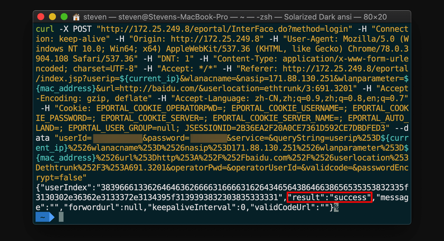 LOGIN_STATUS=$(curl -s -X POST "http://172.25.249.8/eportal/InterFace.do?method=login" -H "Connection: keep-alive" -H "Origin: http://172.25.249.8" -H "User-Agent: Mozilla/5.0 (Windows NT 10.0; Win64; x64) AppleWebKit/537.36 (KHTML, like Gecko) Chrome/79.0.3945.79 Safari/537.36" -H "DNT: 1" -H "Content-Type: application/x-www-form-urlencoded; charset=UTF-8" -H "Accept: */*" -H "Referer: http://172.25.249.8/eportal/index.jsp?userip=${CURRENT_IP}&wlanacname=&nasip=171.88.130.251&wlanparameter=${MAC_ADDRESS}&url=http://baidu.com/&userlocation=ethtrunk/3:691.3201" -H "Accept-Encoding: gzip, deflate" -H "Accept-Language: zh-CN,zh;q=0.9,zh;q=0.8,en;q=0.7" -H "Cookie: EPORTAL_COOKIE_OPERATORPWD=; EPORTAL_COOKIE_USERNAME=; EPORTAL_COOKIE_PASSWORD=; EPORTAL_COOKIE_SERVER=; EPORTAL_COOKIE_SERVER_NAME=; EPORTAL_AUTO_LAND=; EPORTAL_USER_GROUP=null; JSESSIONID=2B36EA2F20A0CE7361D592CE7DBDFED3" --data "userId=${USER_ID}&password=${PASSWORD}&service=&queryString=userip%253D${CURRENT_IP}%2526wlanacname%253D%2526nasip%253D171.88.130.251%2526wlanparameter%253D${MAC_ADDRESS}%2526url%253Dhttp%253A%252F%252Fbaidu.com%252F%2526userlocation%253Dethtrunk%252F3%253A691.3201&operatorPwd=&operatorUserId=&validcode=&passwordEncrypt=false") # 含有变量时只能使用双引号