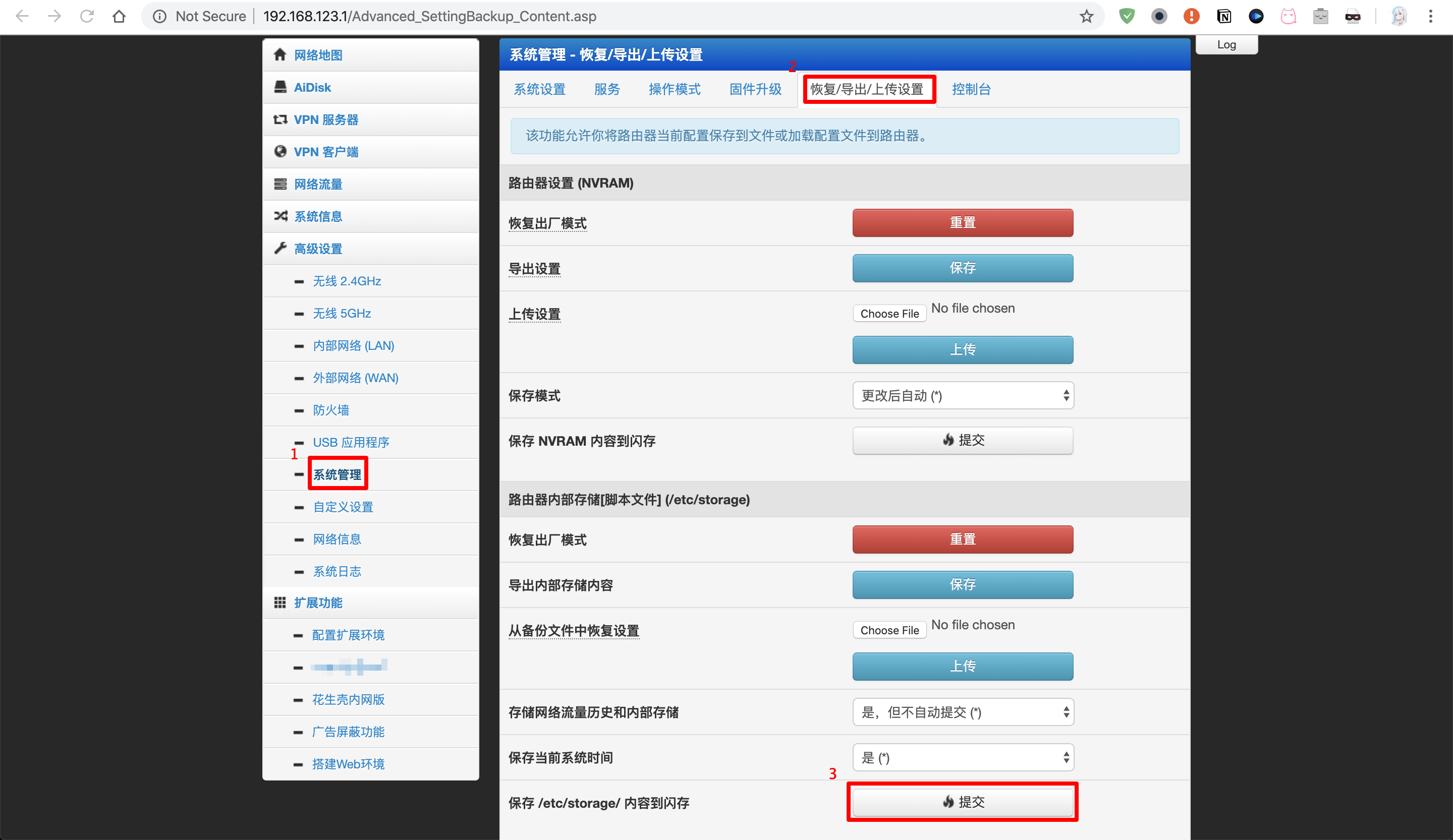 登录到路由器后台,在 系统管理 > 恢复/导出/上传设置 > 保存 /etc/storage/ 内容到闪存 后点击 提交。