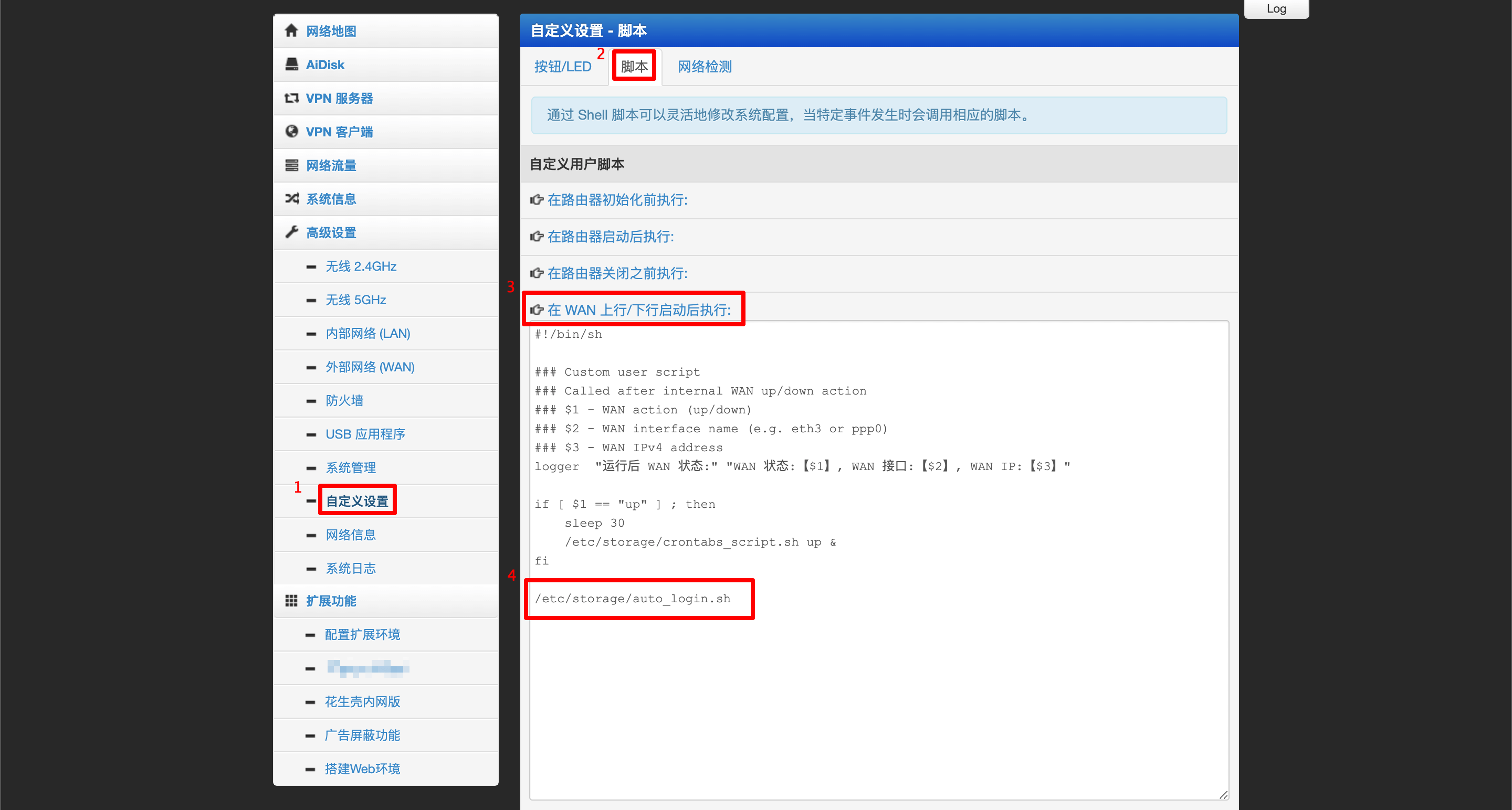最后,在 自定义设置 > 脚本 > 在 WAN 上行/下行启动后执行 的内容后添加一行:/etc/storage/auto_login.sh,并点击页面最下方的 应用本页面设置 即可。