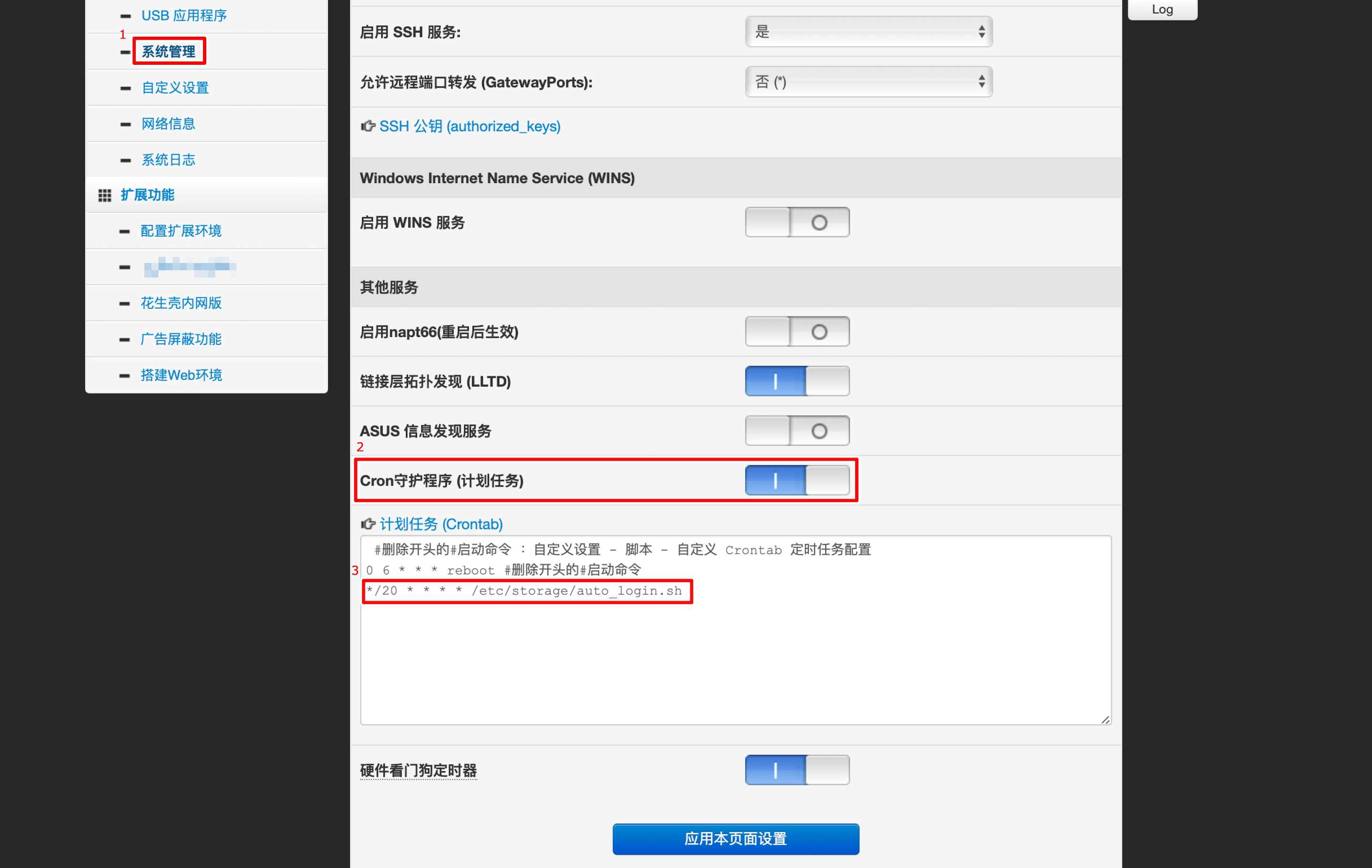 如果你还不放心,那么还可以借助 crontab 每隔一段时间检查认证状态并自动认证,只需要打开 系统管理 > 服务 > Cron 守护程序,然后在 计划任务 中填入 crontab 命令并应用设置即可: